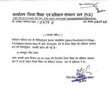 Vacmet Foundation, under its CSR initiative, successfully facilitated the installation of 10 computers with table sets at the District Institute of Education & Training (DIET), Dhar, Madhya Pradesh, on 27th July 2025. This contribution was made as per the directions of the District Collector, Dhar, to enhance digital infrastructure for teacher education and capacity building. The installed equipment is now operational at the DIET Centre and will support educators and trainee teachers in their learning and professional development.