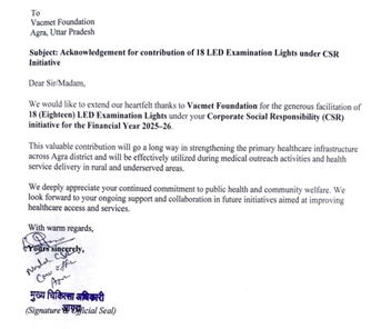 Vacmet Foundation under its CSR initiative for the year 2025–26, proudly inaugurated a Physiotherapy Centre at Maharaja Agrasen Sewa Samiti, Lohamandi, Agra on 27th July 2025. This center is well spaced (2200 sq. ft.), equipped with modern machines and equipment to support rehabilitation and therapeutic care for those in need . The initiative reflects our ongoing commitment to improving access to quality healthcare services, especially for underserved communities.